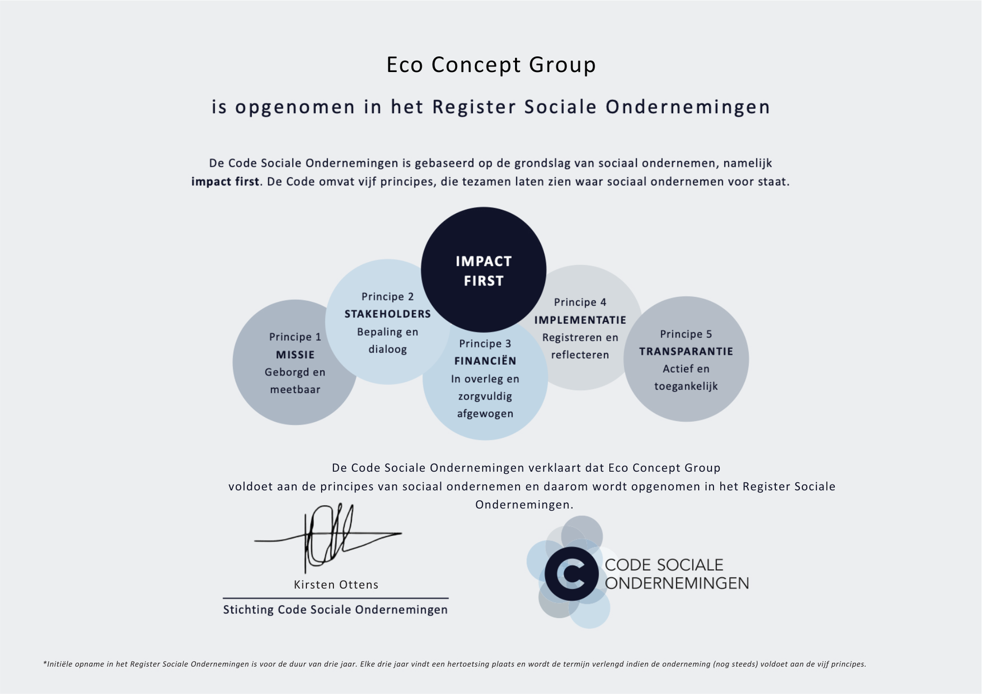 Eco Concept Group is ook aangesloten bij de Code Sociale Ondernemingen. Dit betekent dat wij ons committeren aan de principes van goed bestuur, transparantie en maatschappelijke impact. De Code biedt een kompas voor sociaal ondernemerschap en helpt ons om onze missie – het realiseren van duurzame en sociale waarde – op een meetbare manier na te streven.
